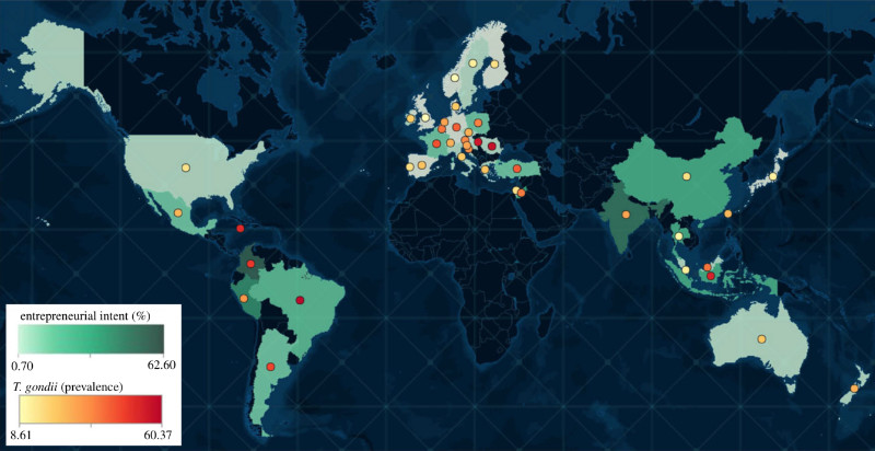 Odcienie zielonego mówią, jaki % osób chce założyć firmę. Odcienie kropek oznaczają częstość nosicielstwa pierwotniaka T. Gondii. No i jak tu nie wierzyć w moc robaków??